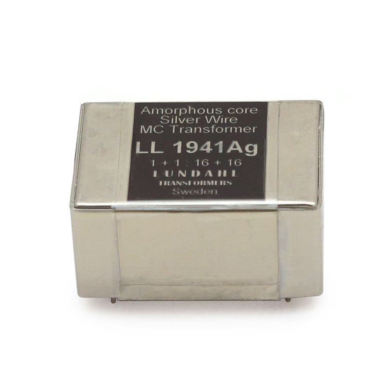 The Lundahl LL1941 AG transformer is a high turns ratio Silver wire version of the LL1931 moving coil step-up transformer. The LL1941AG transformer combines the unique uncut amorphous cobalt core and the dual coil structure with Cardas high purity copper wire Lundahl-Technique in an oversized design. The objective is to provide the best possible MC transformer, cost-no-object, for low output MC cartridges. The dual-coil structure greatly improves immunity to external magnetic fields from power supplies. The transformer is housed in a mu-metal can.